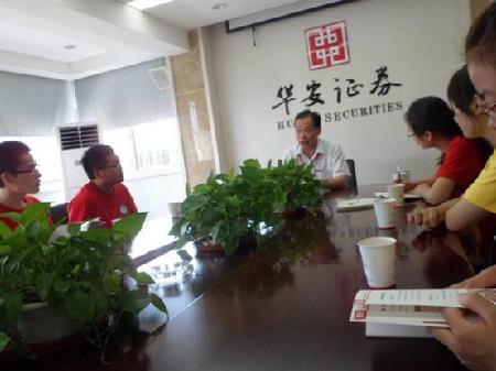 7月23日,7003全讯白菜网陈玉婷、王慧敏、张晨琛等八位同学在王浩副院长的带领下,来到蚌埠市华安证券胜利中路证券营业部,对华安证券在蚌埠市的整体运营情况进行了考察与学习。公司副总经理熊建如热情招待了他们。熊经理非常重视安财学生的这次来访,提前进行了周密的安排,并亲自为他们介绍了华安证券的公司发展历程及现在的整体组织架构。之后,熊经理又安排了公司营销部涂总监和辛经理分别为他们介绍了公司的所有产品和各部门职责分配,并带领他们参观了公司的各个部门,了解各部门的具体工作情况。最后,三位领导在会议室接受了同学们的采访,回答了关于证券公司本身及产品等一系列问题,并就当下大学生关心的就业问题,双方进行了交流讨论。
