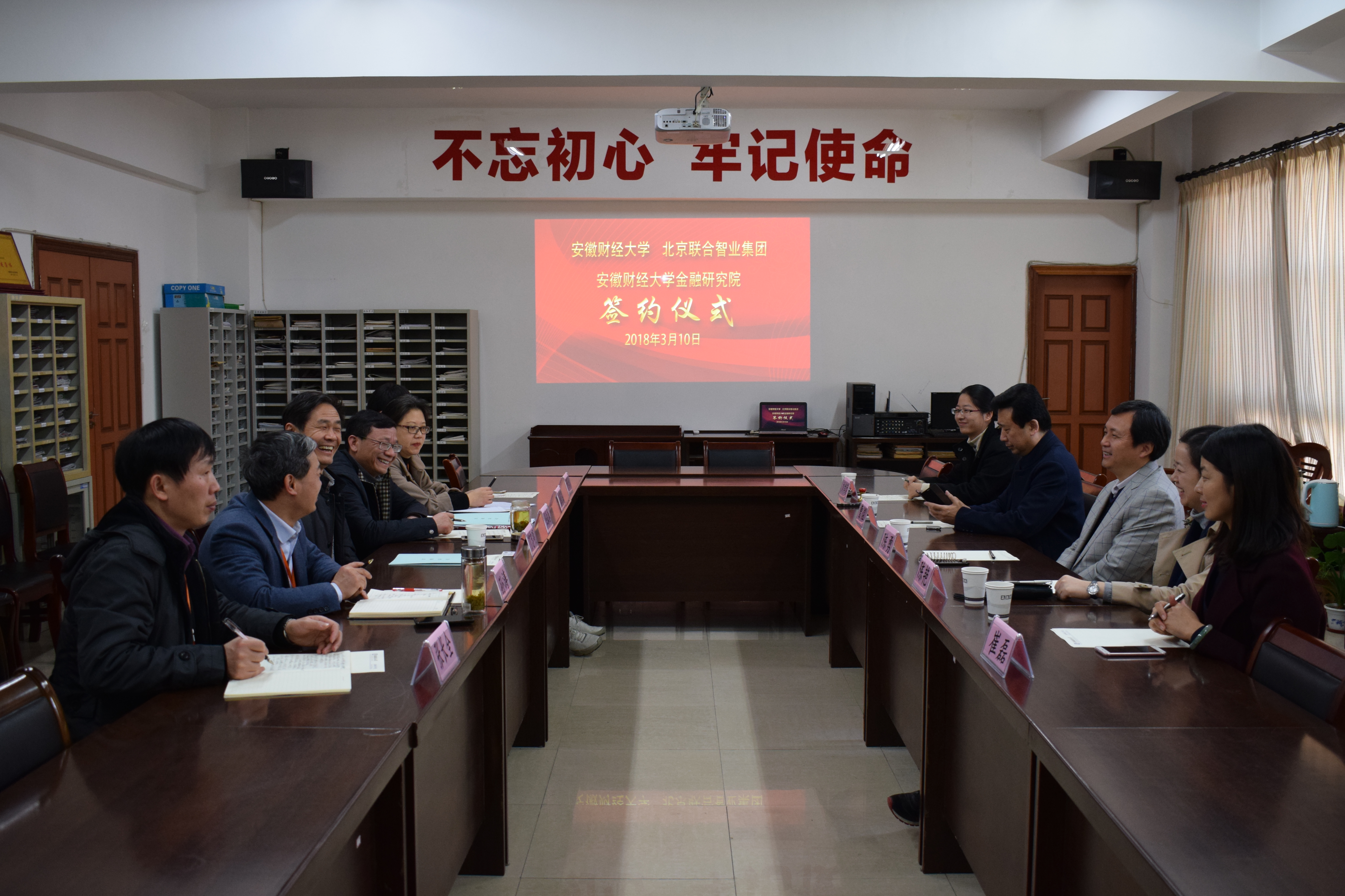 3月10日下午,我校与北京联合智业集团联合组建安徽财经大学金融研究院签约仪式在7003全讯白菜网会议室举行。校党委书记、校长丁忠明,我校校友、北京联合智业集团董事长陈勇出席签约仪式并共同签署合作协议。